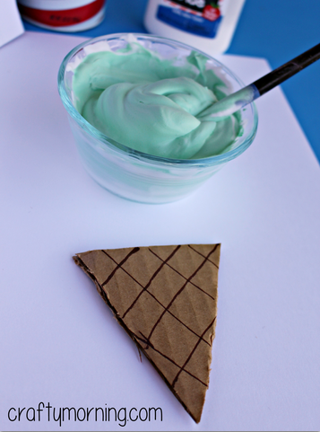 Add some green paint or food coloring to the puffy paint. Cut out a triangle cone with cardboard and draw lines with a marker. (I used an Amazon delivery box I had laying around)